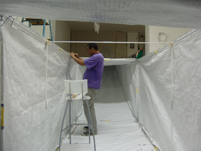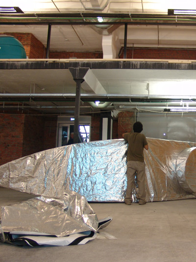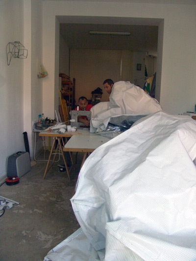The work of measuring and cutting the whole pieces (about hundred meters of tubes being connected) was a meticulous and bloody nerve-wracking activity! Considering a few of centimeters of each piece to ensure that we will have a template and tensed hammerhead. But after a week the hammer was ready to get packed and brought to Moscow. The application of vacuum-bags (you can disinflate it with a common hoover) is very usefull, so you can reduce the volume to a minimum of space. The silver plastic piece, you can see at the left of the photo is the complete material compacted!!!