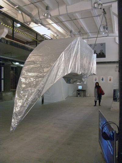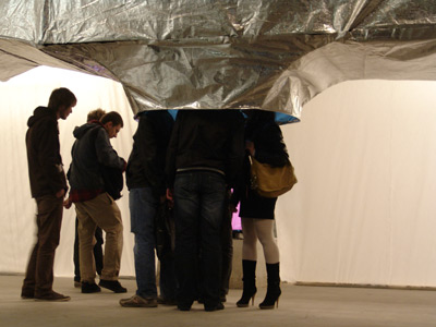 It was clear that we wouldn’t present an inflatable again, but we wanted to use the same material and the same form for constructing the installation. The next problem was to build the installation by maintaining the real dimensions of the first activist hammer sent to Mexico. So the idea was to construct the head of the hammer in its original dimensions and to install a video-screening inside the construction. Then the visitors can enter into the hammer and see the video of the project started 2010 in Berlin/Wedding at okk/room29 by eclectic electric collective and okk.