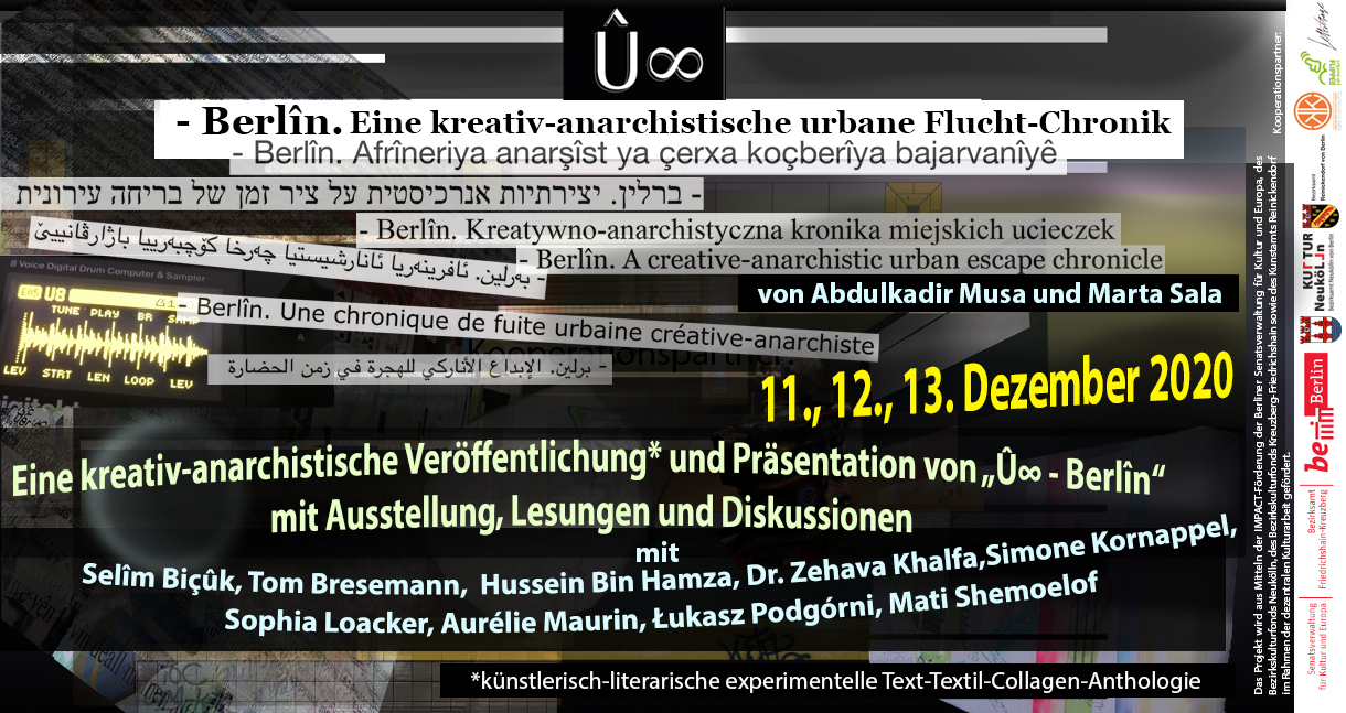 im Rahmen des Projekts “Û∞-Berlîn Eine kreativ-anarchistische urbane Flucht-Chronik” laden wir Euch zu einer virtuellen Veranstaltungsreihe (11.,12.,13. Dezember 2020, jeweils um 18 Uhr) mit Lesungen, Diskussionen, Ausstellung und Präsentation der Text-Textil-Collagen-Anthologie.