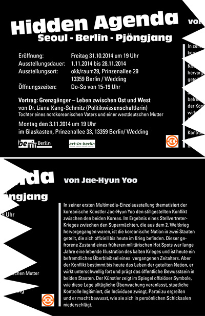 Anlässlich der Präsidentschaftswahlen in Südkorea 2012 und des diesjährigen 25. Jahrestags des Berliner Mauerfalls thematisiert der koreanische Künstler Jae-Hyun Yoo* im okk/raum29 in Berlin-Wedding in seiner ersten Multimedia-Einzelausstellung den stillgestellten Konflikt zwischen den beiden koreanischen Staaten.