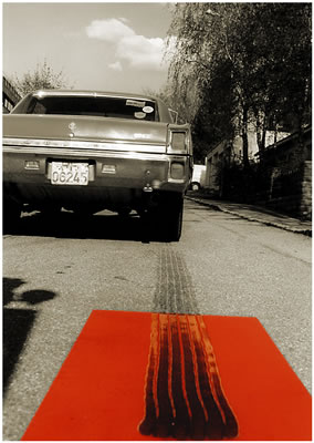 Auf insgesamt 4 orangefarbenen Bodenplatten zeigen sie authentische Reifenspuren von startenden Muscle-Cars.