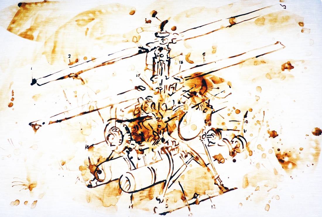 To produce human breastmilk drawings, image sources are found, photos, drawings and film sequences sifted through, researched according to technical terms, digitally enlarged, printed and edited. The printed templates are placed on a light table and traced in milk. In doing so, the specific properties of splattered milk were used to spray around and highlight some areas and obscure others. Experimentation led to figuring out how milk moves if used with a brush or a pen to draw and/or paint and how it would splatter, how large and pointed the individual spots would thin out and become lighter, how to make the milk move with a blow dryer so the splotches would tend more in one or the other direction, and how to develop a solid sense of the degree of blackness the material would have when it was burned with a technically adjusted iron. The image sources are selected according to their content, but also because of their formal qualities. The entire range of material variations are explored and used: shading, brush strokes and lines taper off and are layered, thickened, dramatically splashed, and perspectives are used and exploited to achieve a maximum atmospheric effect.