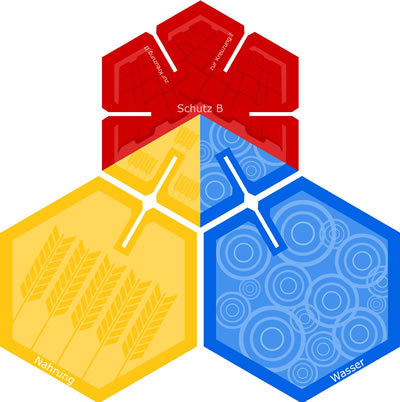 Im Grunde genommen ist jeder Migrant, der seinen Herkunftsort verlässt, auf der Suche nach besseren Lebensbedingungen. Die 19 Push-Faktoren, unter wirtschaftlichen, sozialen, katastrophenbezogenen, demographischen und politischen Gründen eingeordnet, wird in Form des Basismoduls mit den drei Elementen „Wasser“, „Nahrung“ und „Schutz“8 abstrahiert. Grundsätzlich ist es der Mangel an den genannten Elementen, der einem Menschen Anlass gibt, sich von einem Ort zum anderen zu bewegen. Das Basismodul fungiert als Grundkonstruktion, um im Spiel seine Erlebnisse als Migrant überhaupt aufbauen zu können. Es ist die Voraussetzung bzw. Grundlage, um jede Phase der Migration durchlaufen und um im Spiel bleiben zu können.