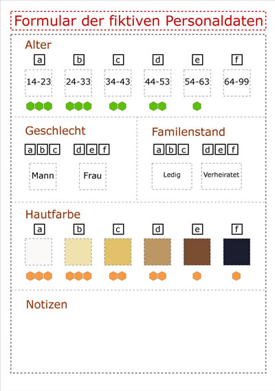 Nach meiner eigenen Erfahrung, die ich mit verschiedenen anderen Fällen vergleichen konnte, kann ich bestätigen, dass die Chance auf Arbeit und nicht selten von der Hautfarbe abhängt. Diese These wird im Spiel durch das Formular repräsentiert, das am Anfang ausgefüllt werden muss (SieheKontakte Abbildung S.32). So bekommen die jüngeren Migranten mit hellerer Hautfarbe mehr Chancen als die älteren und die mit dunklerer Hautfarbe – an die jüngeren werden Steckkarten vergeben.