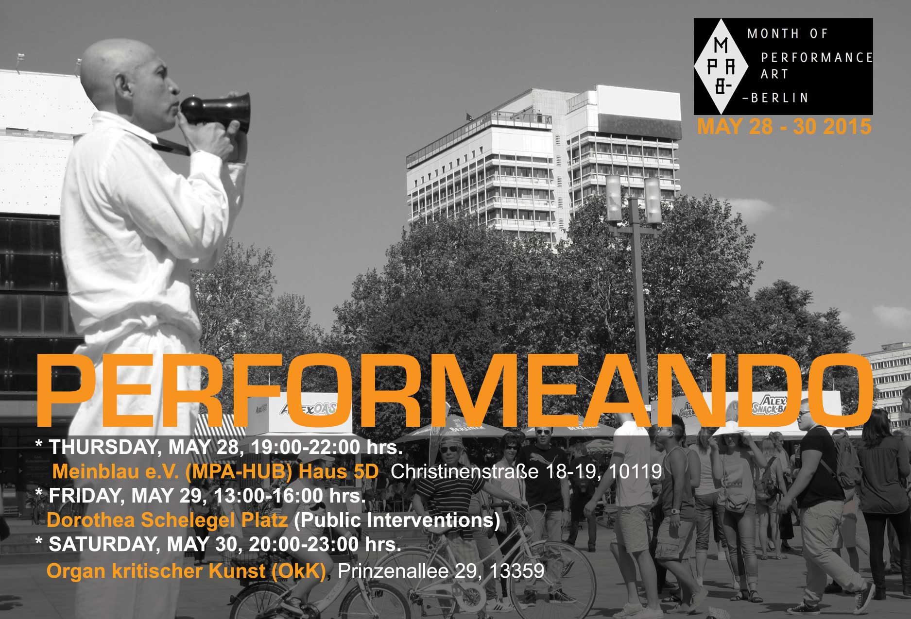 PERFORMEANDO (Spanglish word, coined by artist Hector Canonge in the context of Live Action Art) refers to the creation of an event, presentation, act, action, and/or artistic corporal expression. PERFORMEANDO is a project / program focusing on featuring works of performance artists who identify themselves as Latin/o/a or Hispanic living and working in the United States and Europe and it was launched in New York City in 2013 featuring local Latin artists in the NYC tri-state area. In 2014, PERFORMEANDO was presented, for the first time in Berlin with artists coming from different regions in the United States. In 2015 PERFORMEANDO continues with its programming in NYC, Berlin during the Month of Performance Art, and in Argentina, South America.